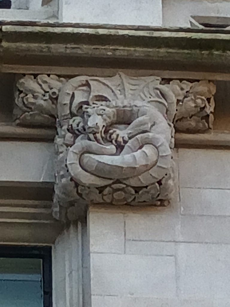The walk is a gentle, circular meander through a small area packed with interest. It is focused on children but happy to involve adults. It is wheelchair friendly too and guide dogs are welcome. As the animals are to be found on buildings, we will be spending much of our time looking at wall decoration from the bottom up. Everywhere we look, there will be something to see – often something surprising. The walk is led in English.